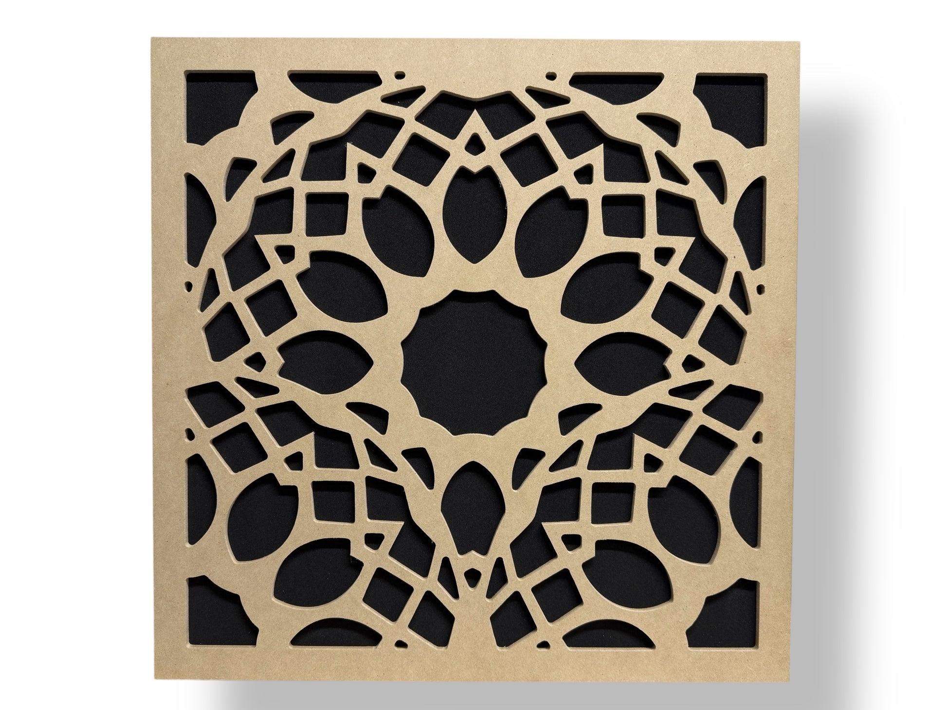 Inspired by celestial architecture and the geometry of light, Style #65-1 “Skye” features a radiant, starburst pattern that adds an air of sophistication and depth to any room. The intricate lattice is paired with 1/8” sound-absorbing neoprene foam backing, enhancing both the visual appeal and the acoustic comfort of your space.