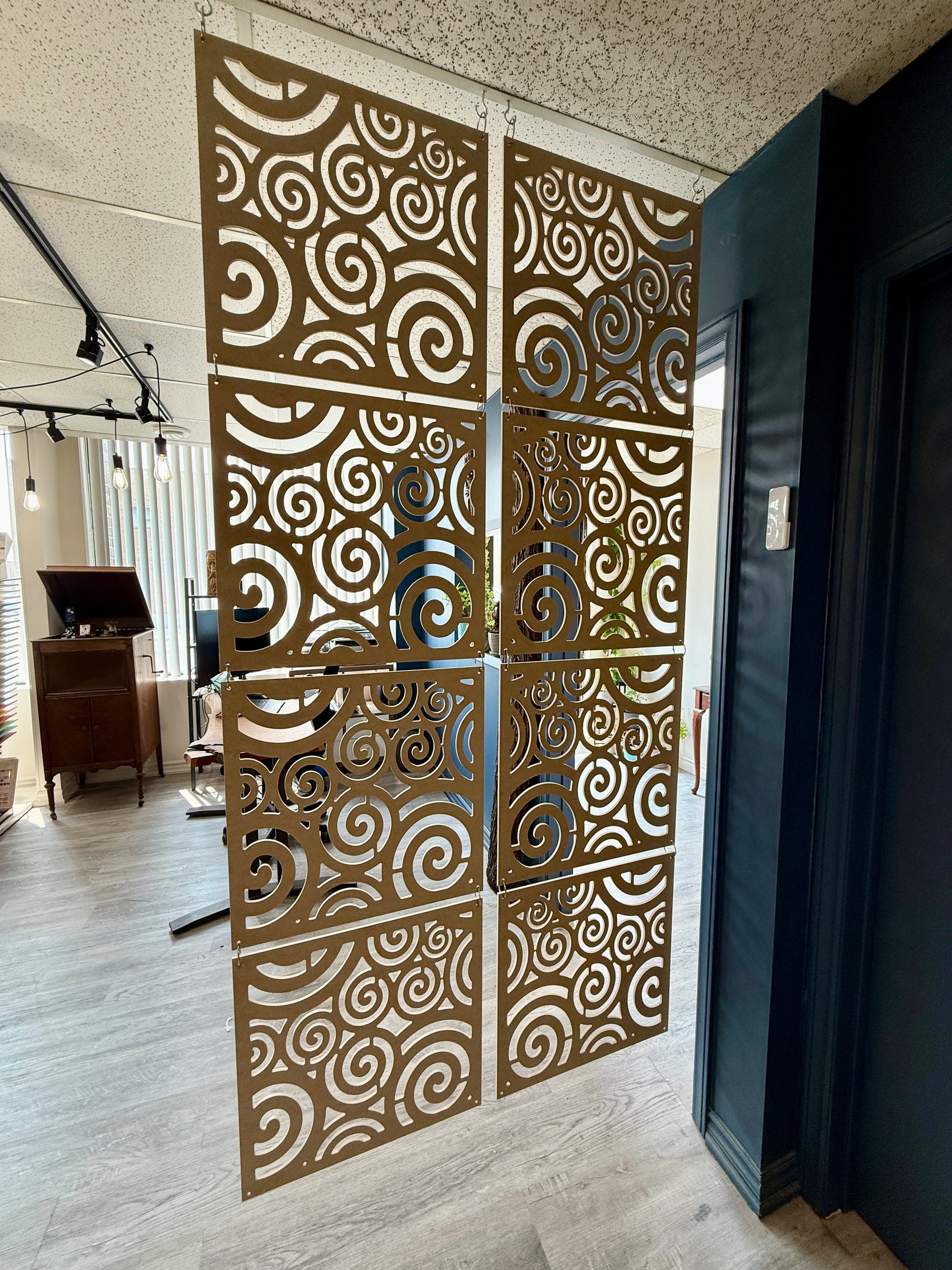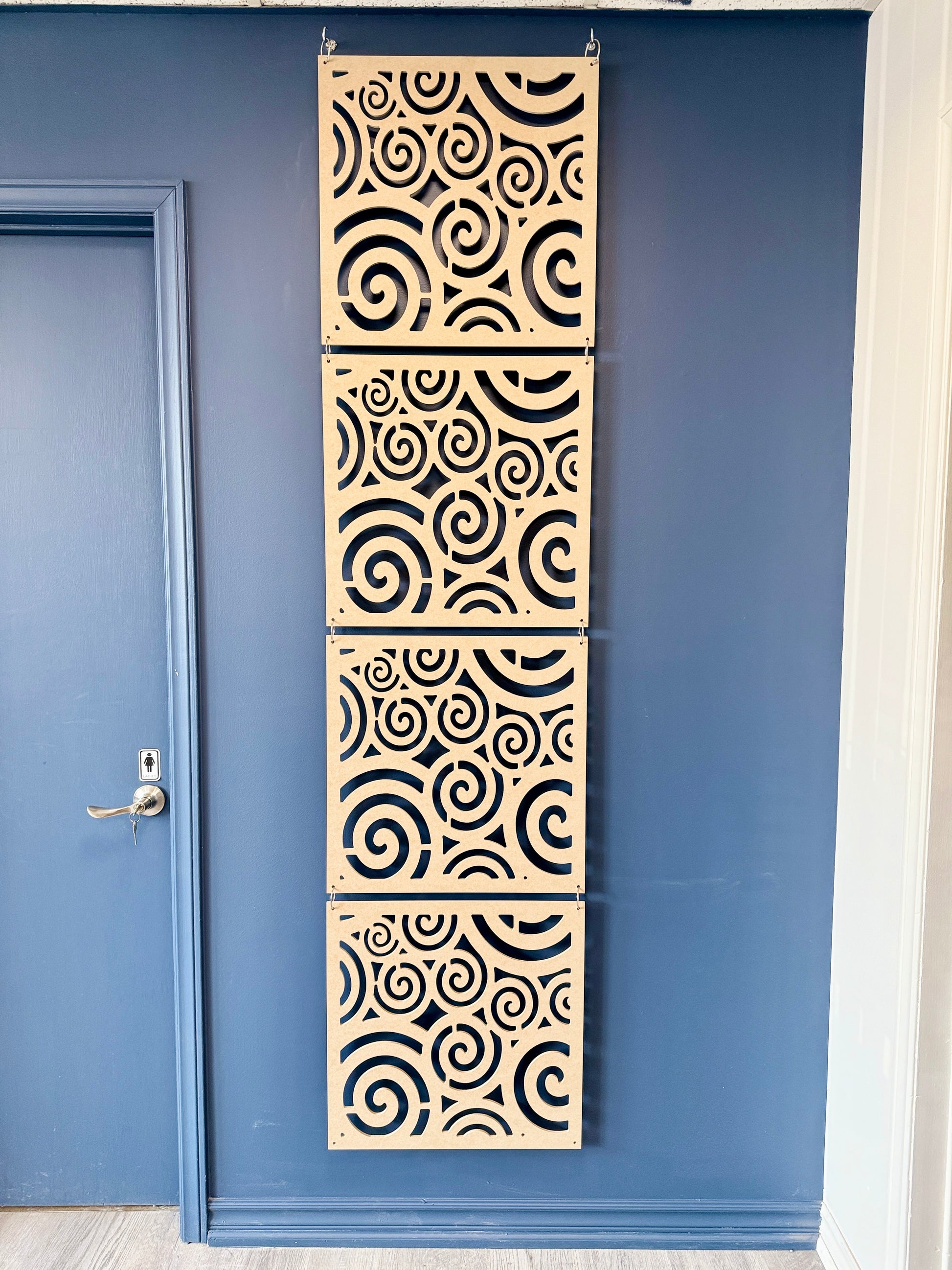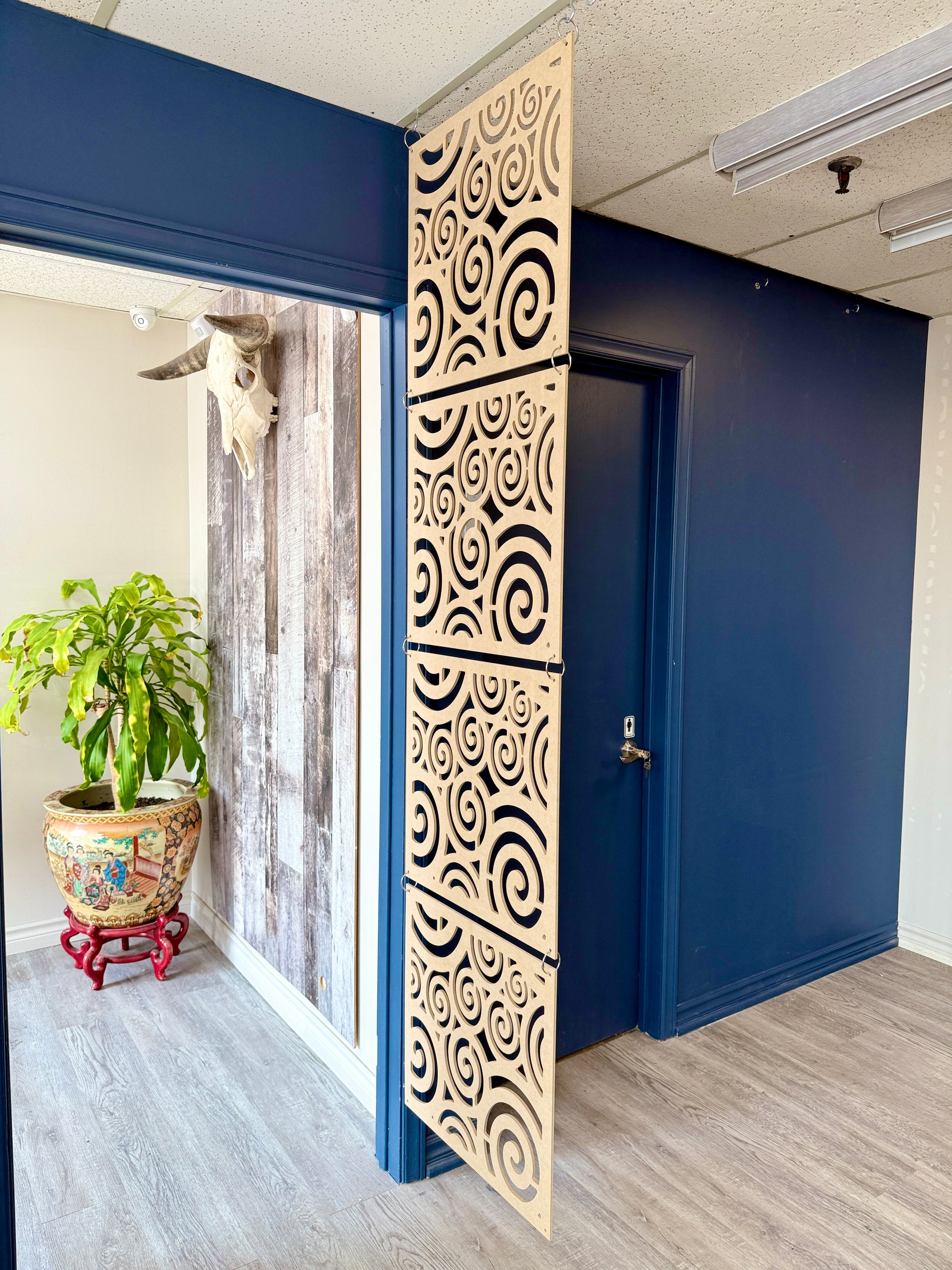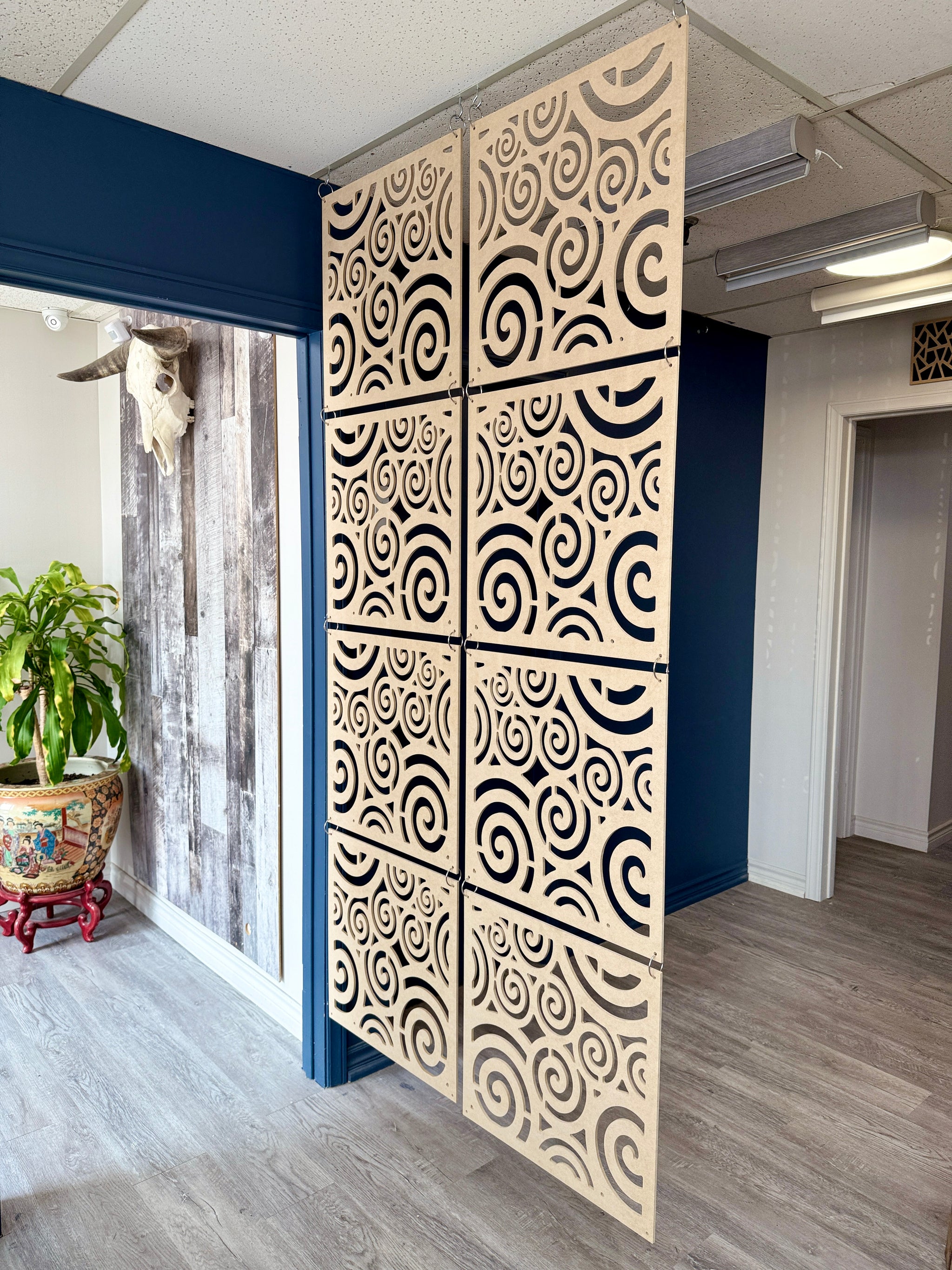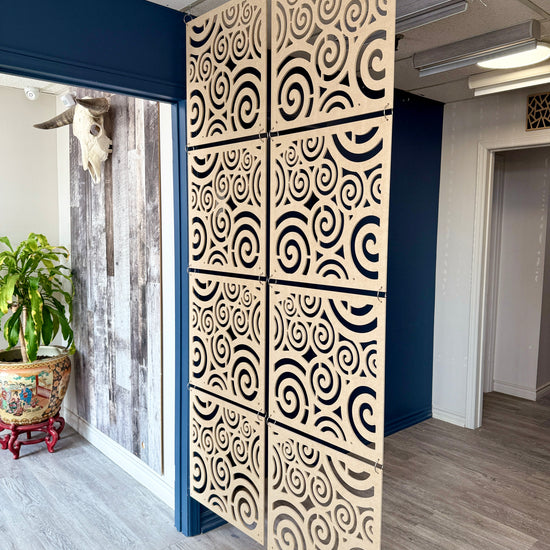 Each set includes 4 CNC-cut panels, ideal for use as room dividers, statement wall features, or overhead decorative panels.