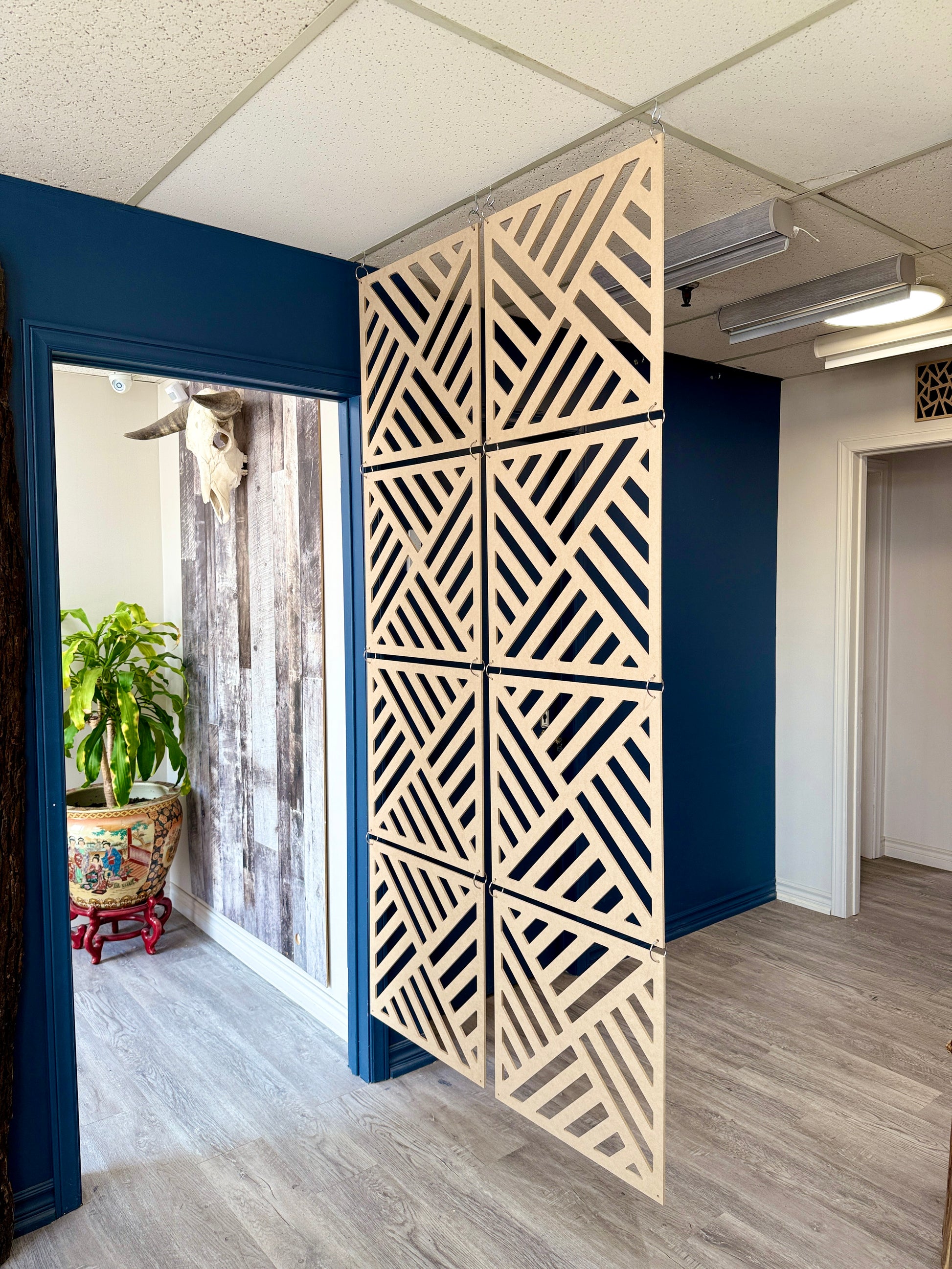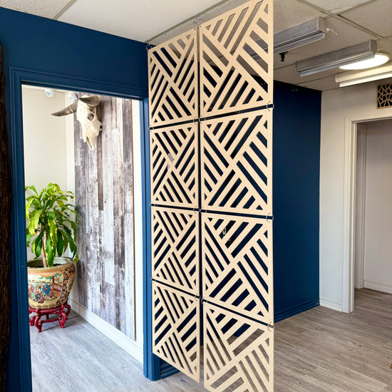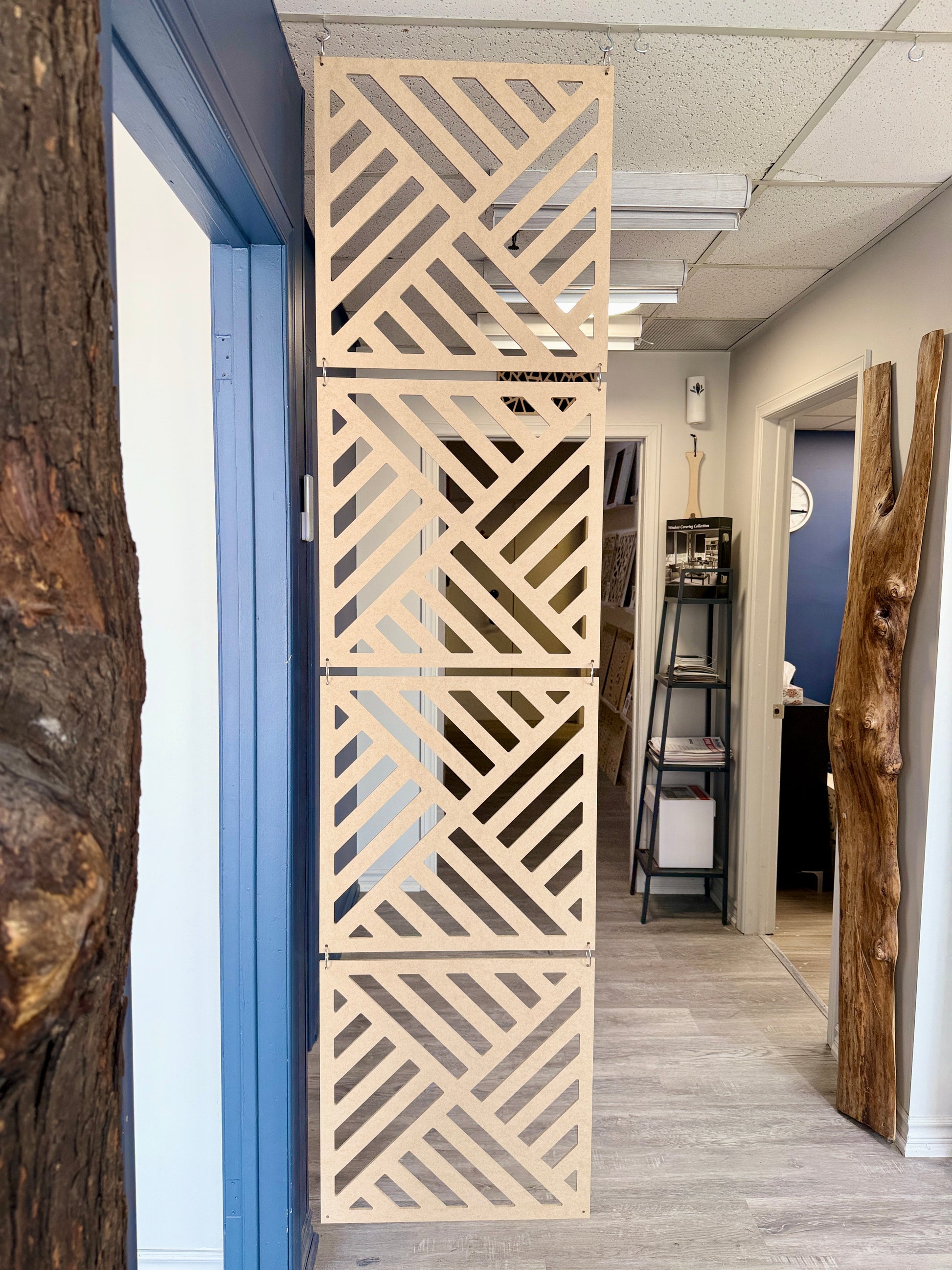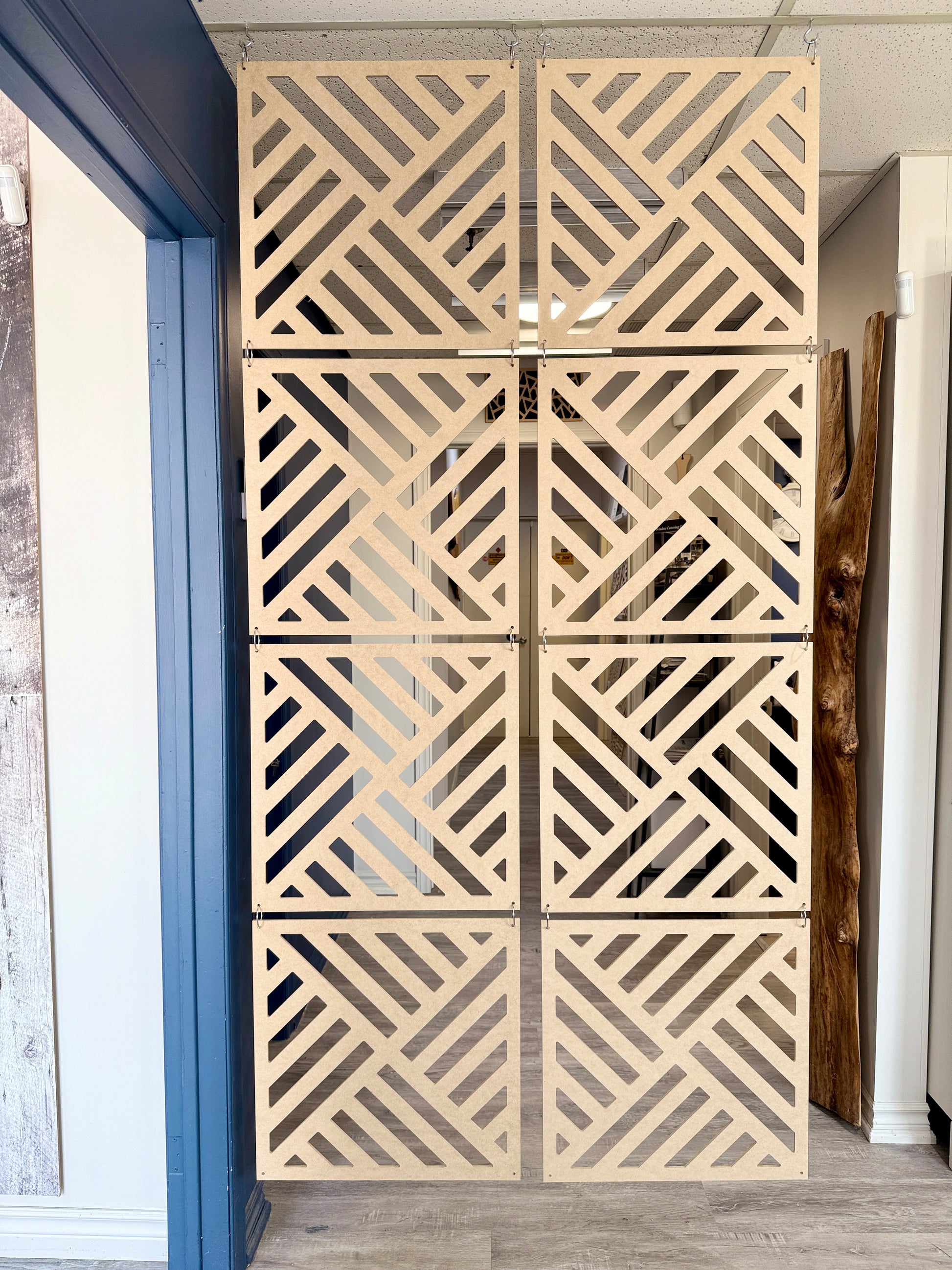 Inspired by the graceful motion and agility of a young fawn weaving through a forest of light and shadow, Style #33 – Fawn brings energy, clarity, and bold structure into any space. The design’s crisp, crisscrossed diagonals offer a rhythmic visual flow—both calming and architectural. Whether used as a modern room divider, wall art, or ceiling feature, this panel introduces refined contrast and movement into any interior.